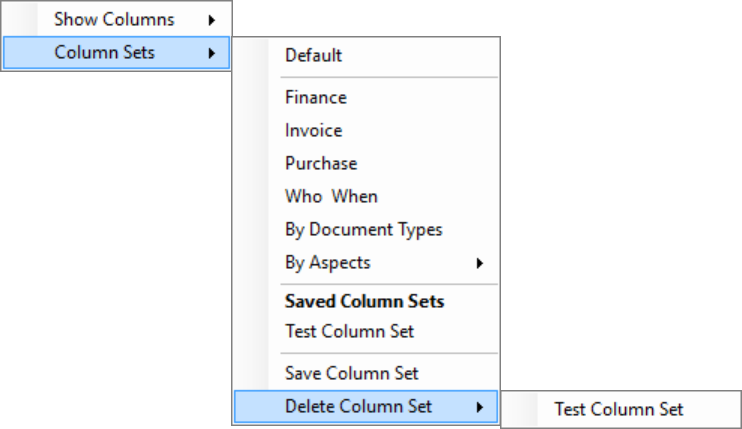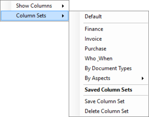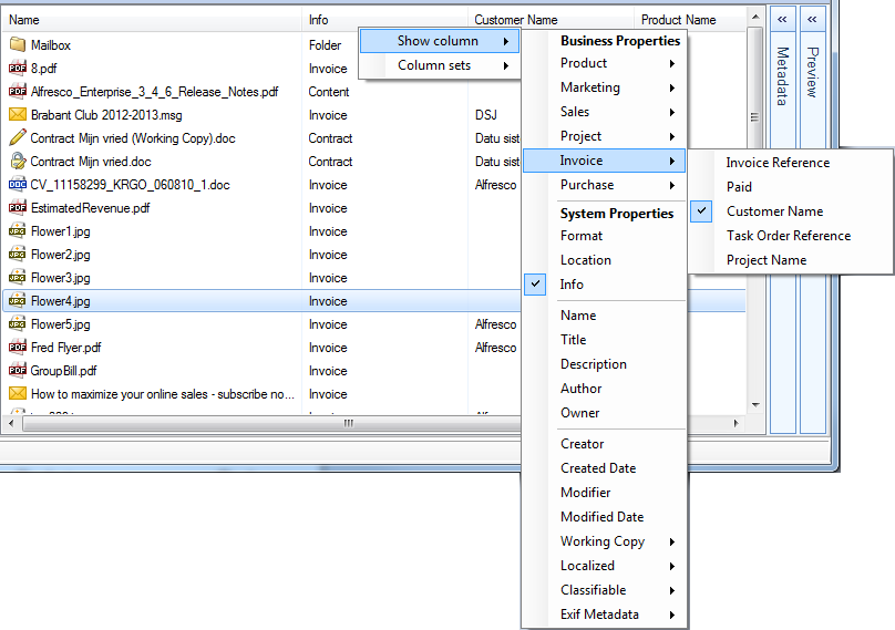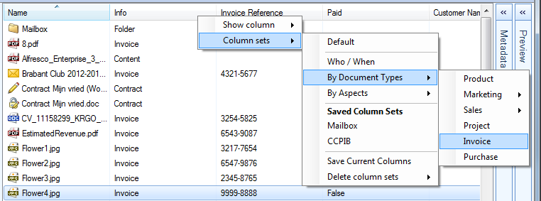 The predefined column sets are the document types defined in the Alfresco document model. Selecting one of these document types will show all metadata fields related to this document type in the columns.