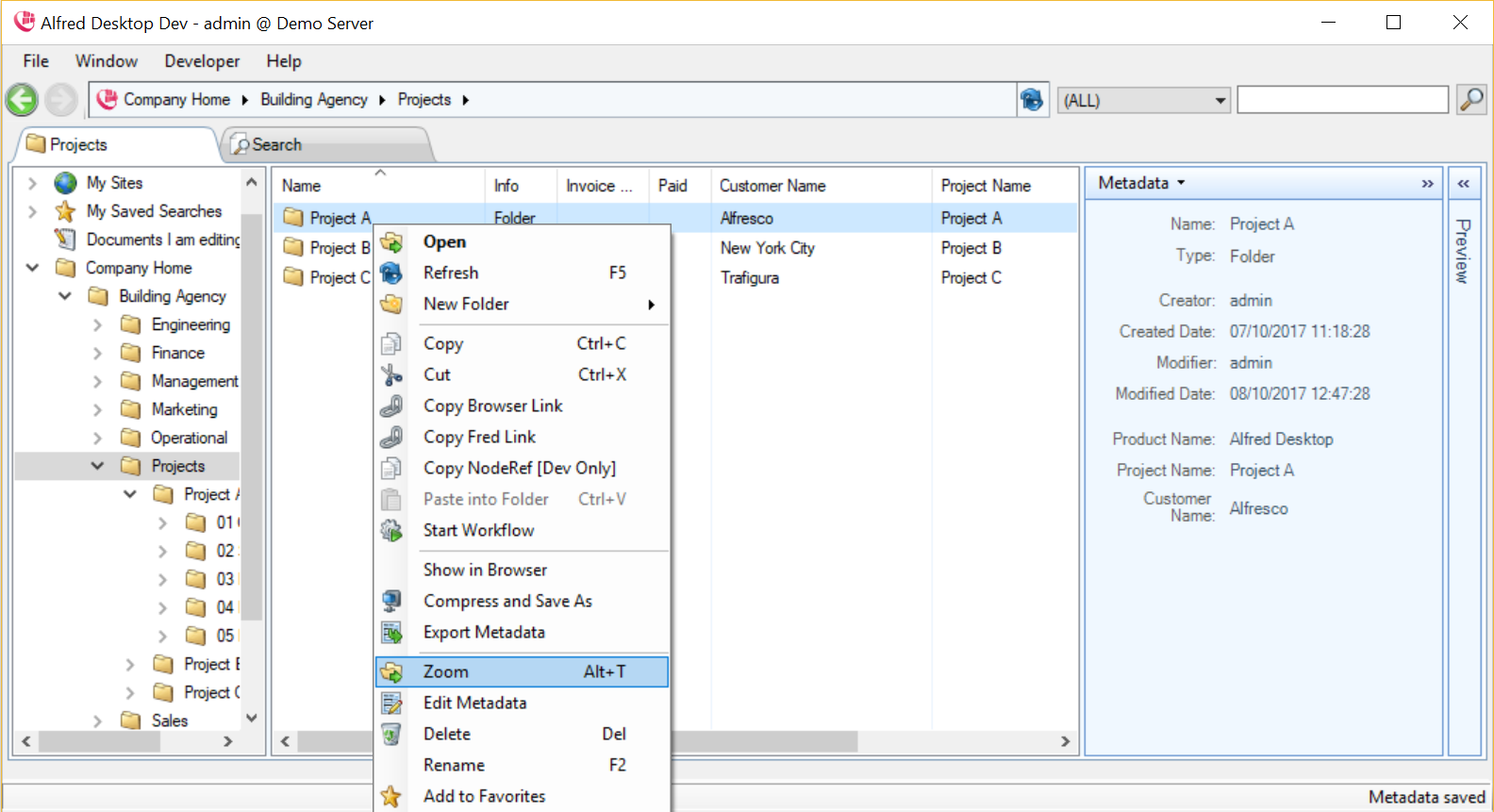 The Zoom function provides alternative and extended navigation functionality in a subpart of the folder structure. It is mainly used to provide a different view of the content in, for example, a project folder.