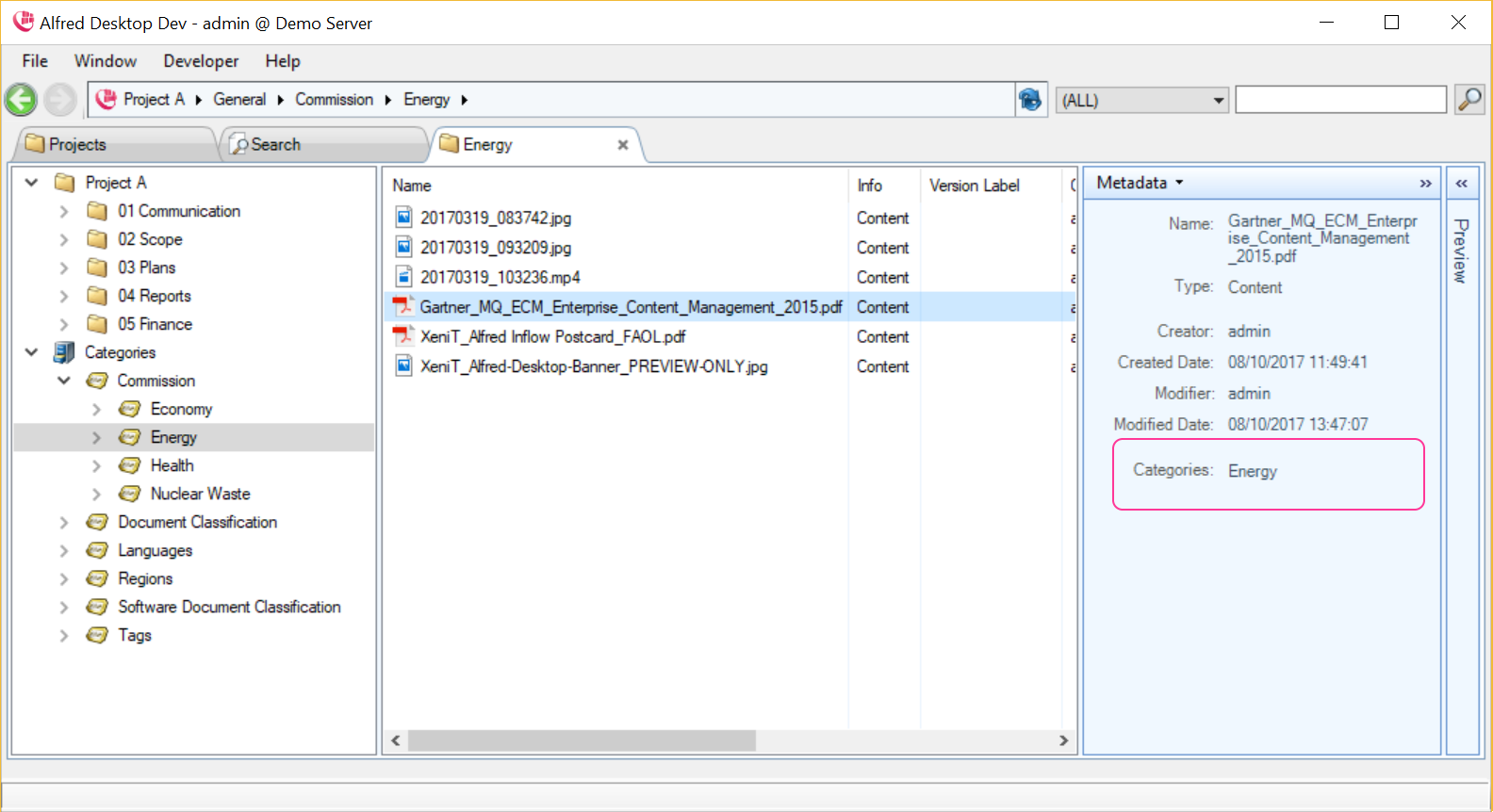 In the example below, selecting Commission will present all documents for project A, which have been tagged with the categories ‘Commissions’, ‘Energy’ and ‘SME’.