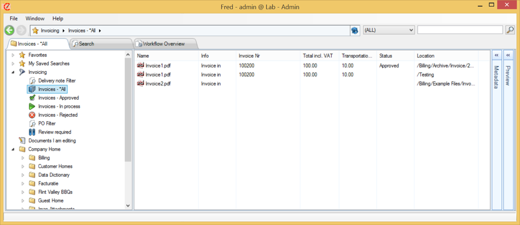 A Virtual folder is a filtered view on a part of the document repository. It allows you to create a virtual folder structure based on filtered views on the repository.