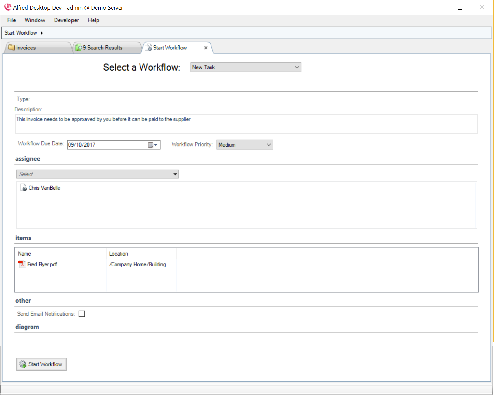 In the repository, you can launch a workflow from one or more selected content items, whether they are files or folders. Starting a workflow generates a workflow task for the users assigned to the task.