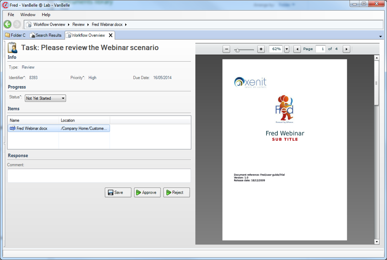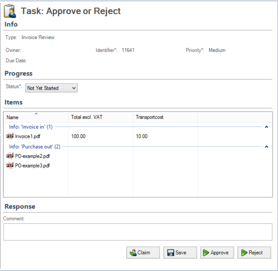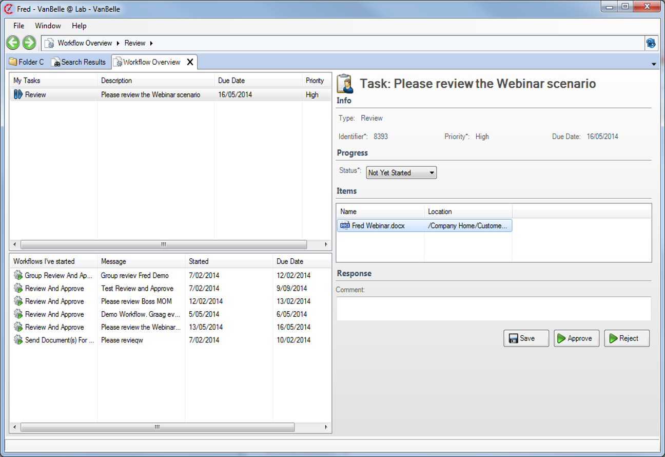 Approve or Reject: When you have completed a task, you can update the task status, add a comment indicating the work performed, and then click either Approve or Reject. The task returns to the user who started the workflow and no longer appears in your task list.