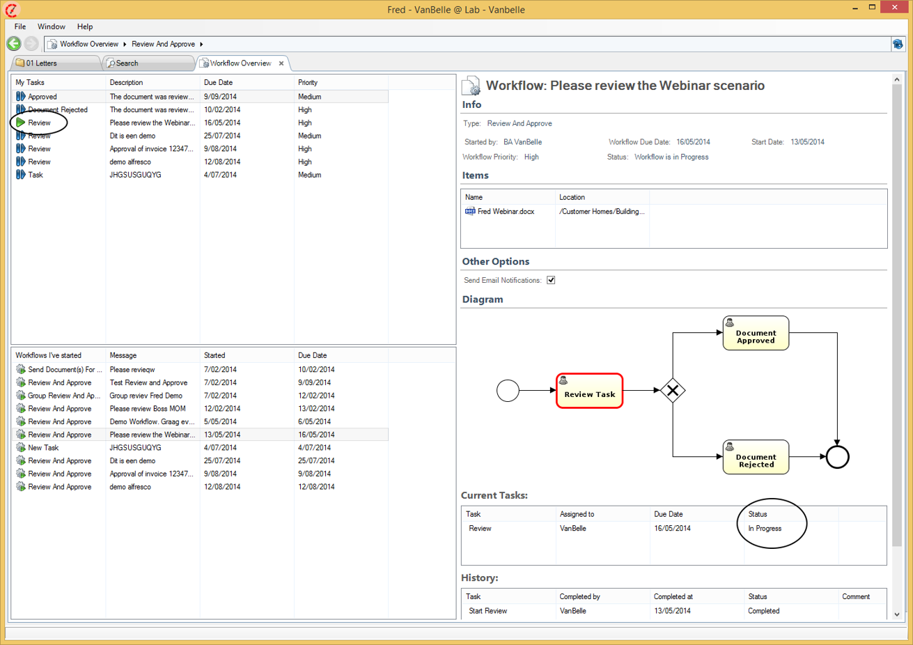 The workflow overview provides you with a view of the Tasks assigned to you and the workflows you have started.