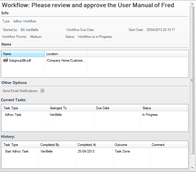 Tasks generated by the workflow will appear in the user\’s My Tasks list in the Workflow Overview. An email is sent to the email address listed in the user\’s profile. If an address is not provided, no email will be sent.