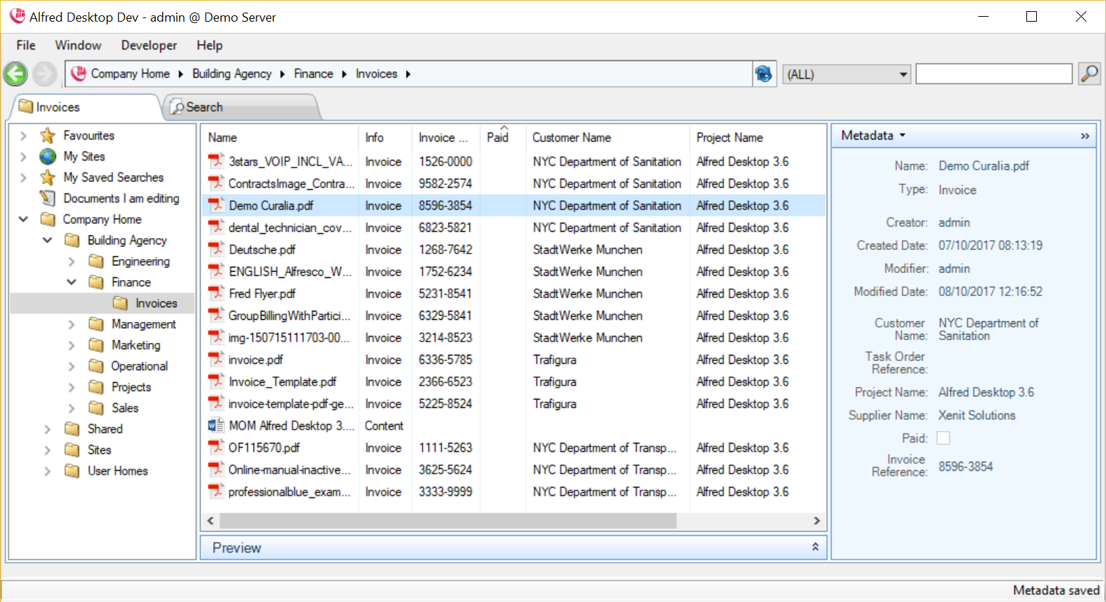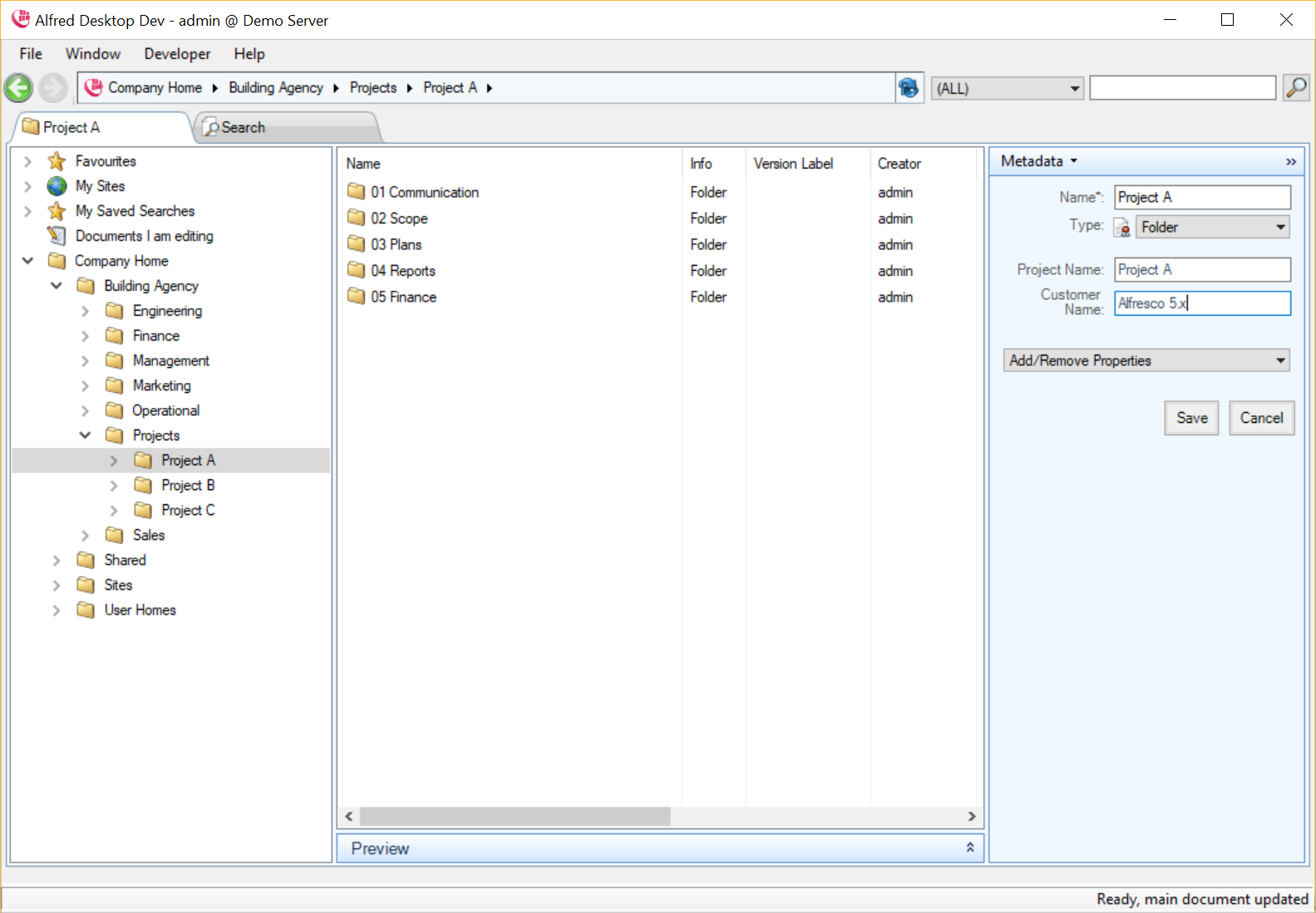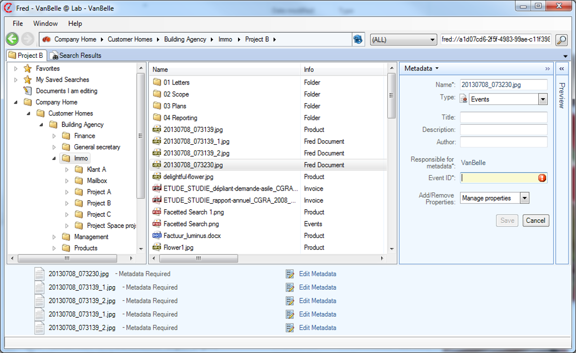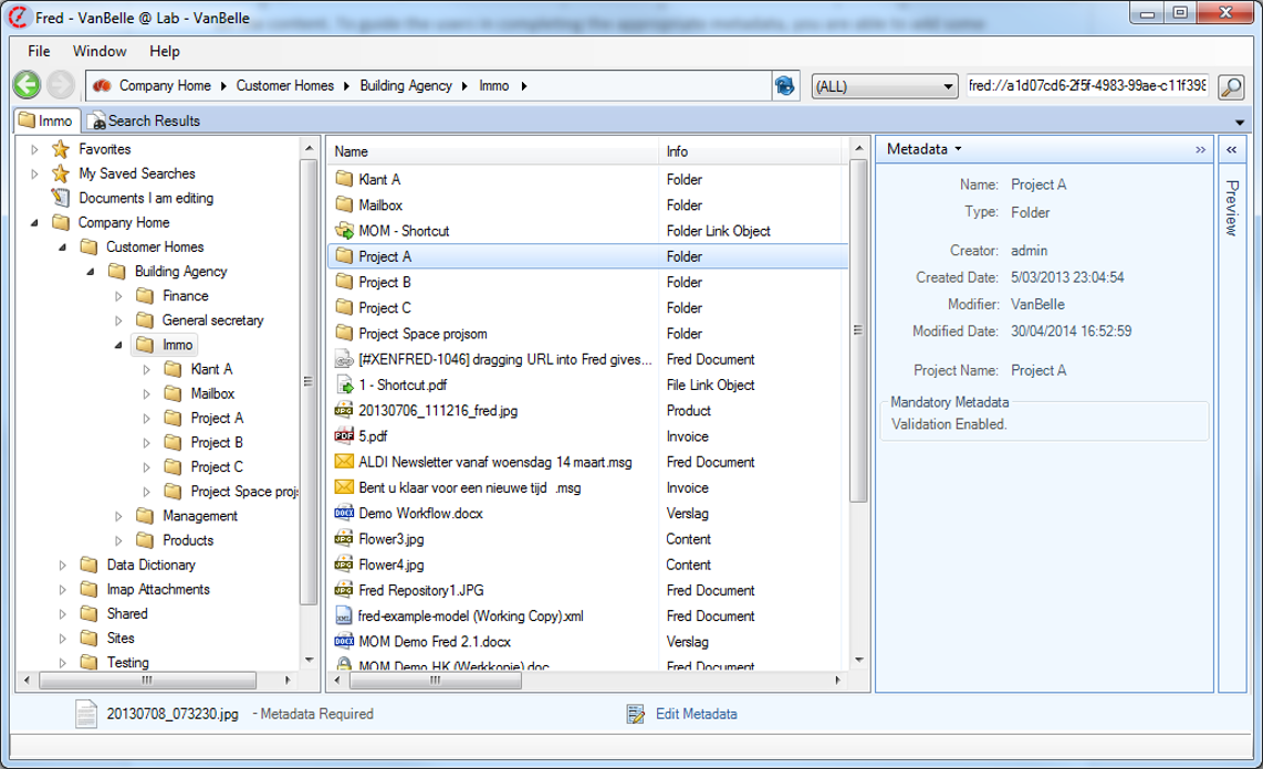 In the example above, you will see that this document type is a “Project”, which has the standard metadata field (creation date, creator, etc.) and some specific metadata fields (project name, customer name, etc.).