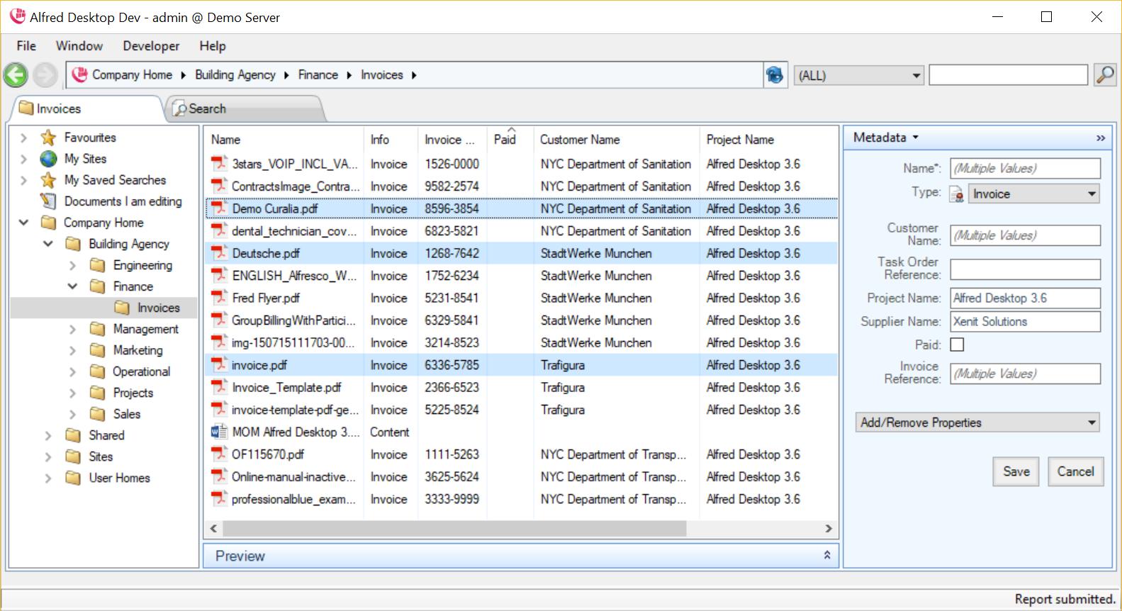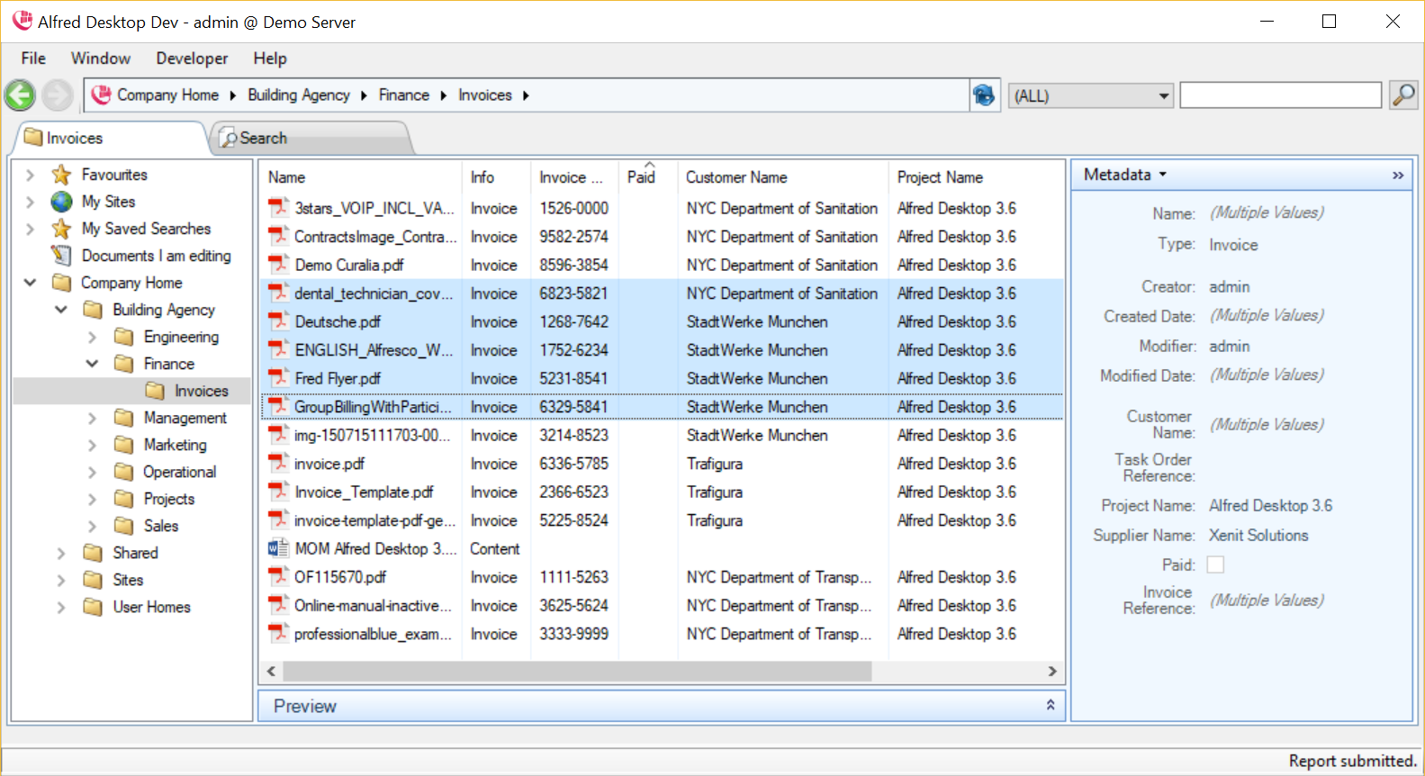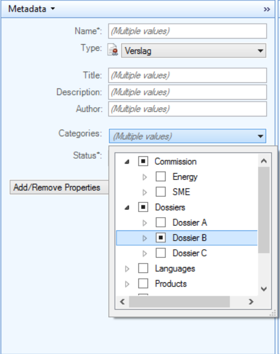 Selecting documents in the Details pane will show the metadata fields which are common for the selection in the Metadata pane. Where all fields are blank or have identical values, they will be presented in the view mode. In the view mode of the Metadata pane, fields that have different values in the document selection will be marked as ‘Multiple values.’