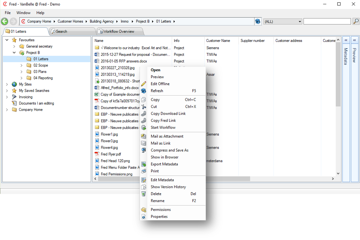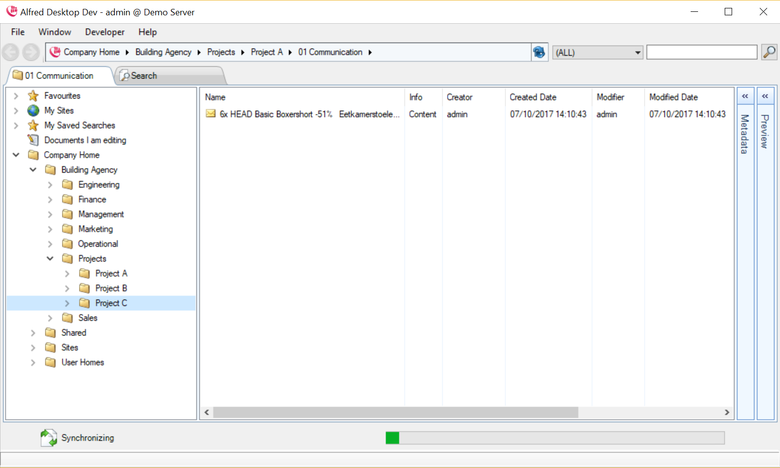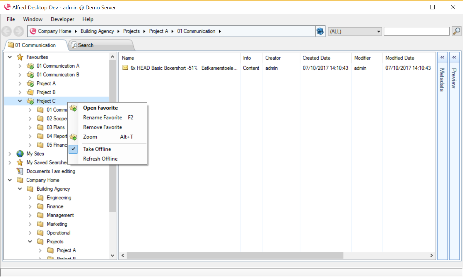 You can take part of your repository offline. In the offline mode, you are able to navigate through your offline structure, view the related metadata, and open the documents you have selected to take offline.