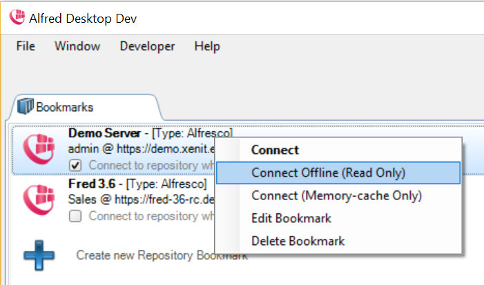When you are offline, you can connect to the local repository via the Bookmarks menu. First, make sure to disconnect from the network by clicking on File/Disconnect. In the list of repositories, right click the bookmark you want to connect to, and select Connect Offline.