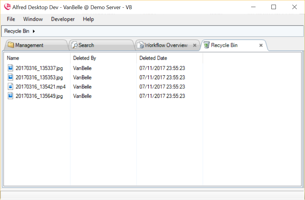 The recycle bin enables you to restore deleted files and folders, similar to the Windows Recycle Bin.