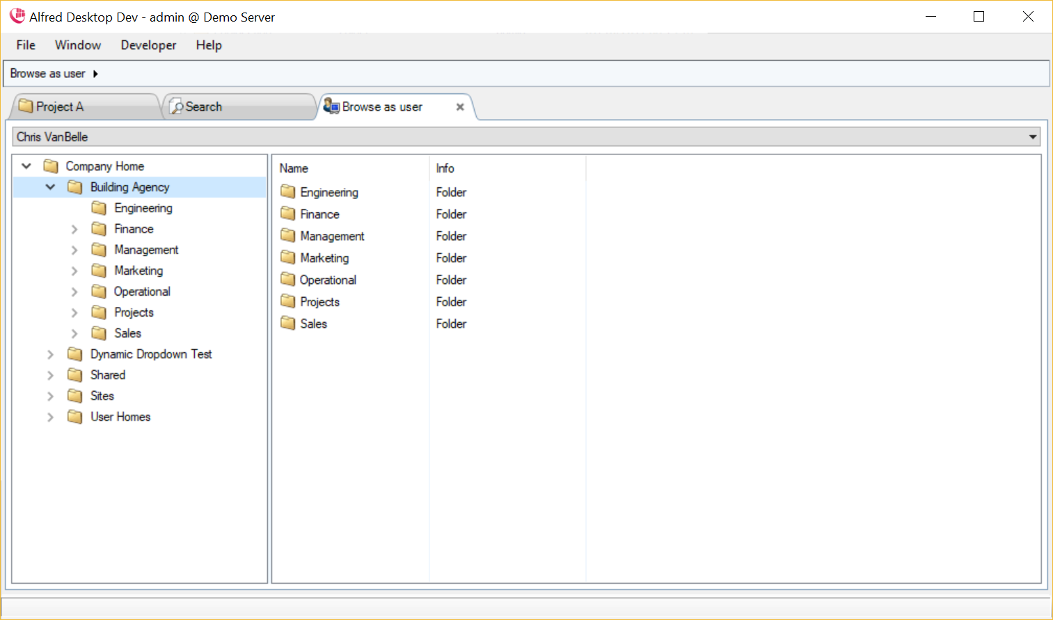 In the upper textbox, fill in the relevant Alfresco username and click on “Switch User”